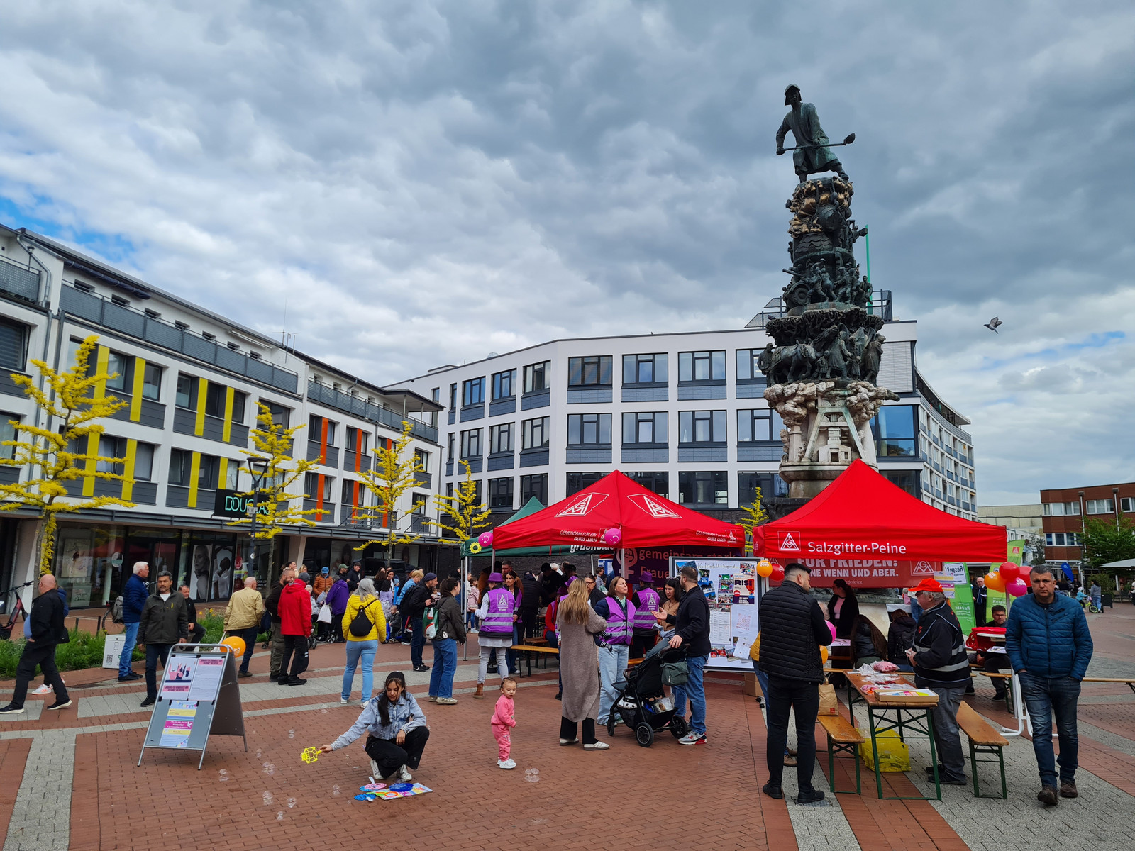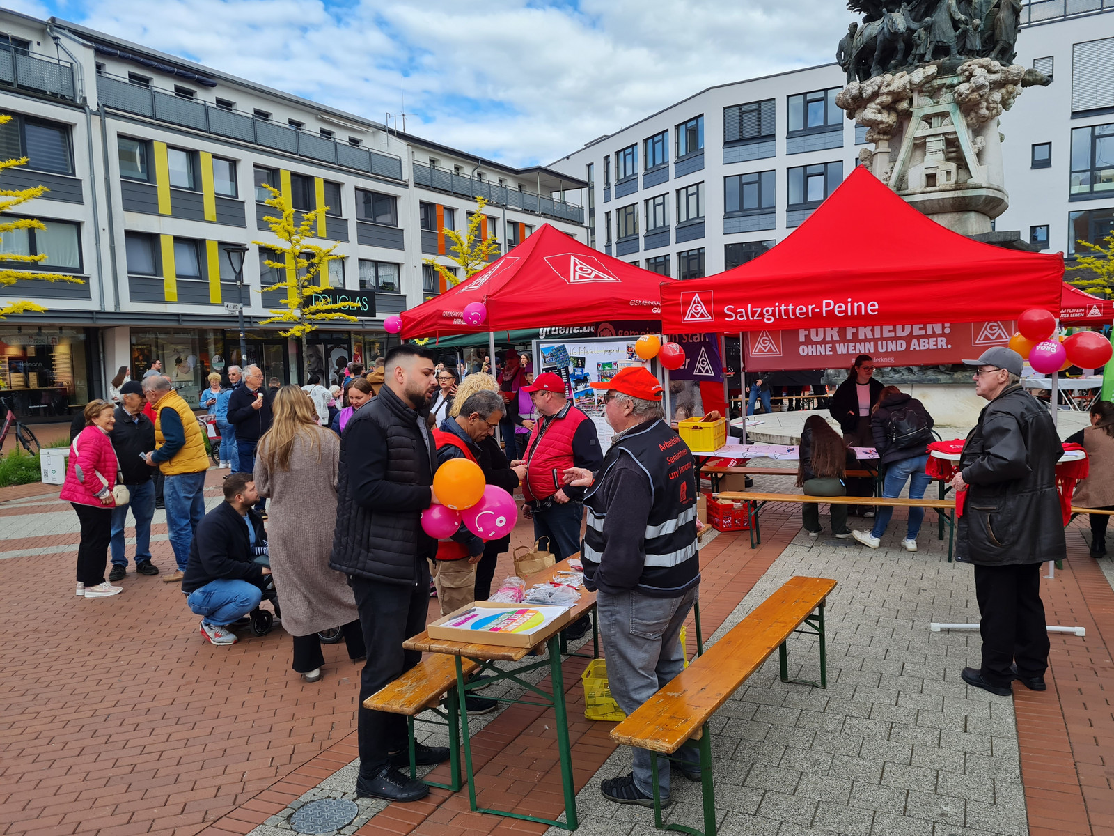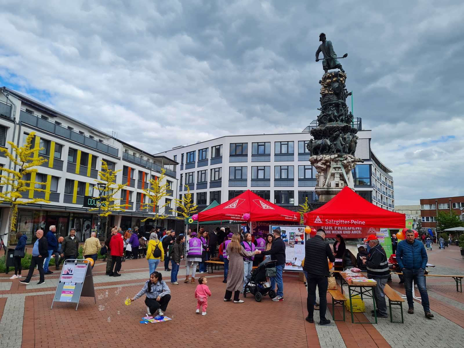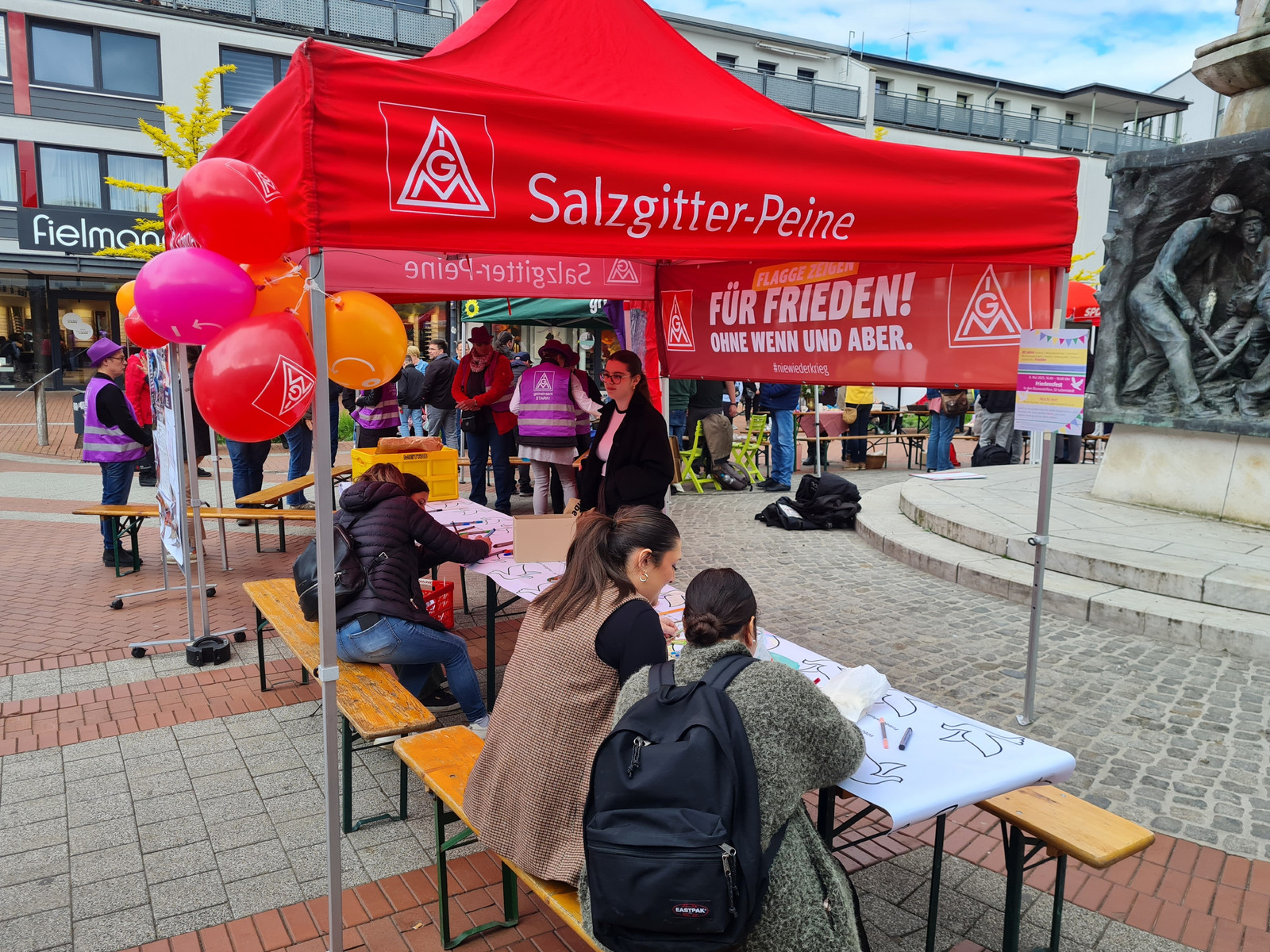 Am Nachmittag luden der Arbeitskreis Stadtgeschichte, die IG Metall Salzgitter-Peine und das Bündnis für Demokratie und Toleranz zu einem Friedensfest in die Lebenstedter Innenstadt ein. Von 16:00 bis 18:00 Uhr versammelten sich zahlreiche Besucher:innen rund um das Stadtmonument.