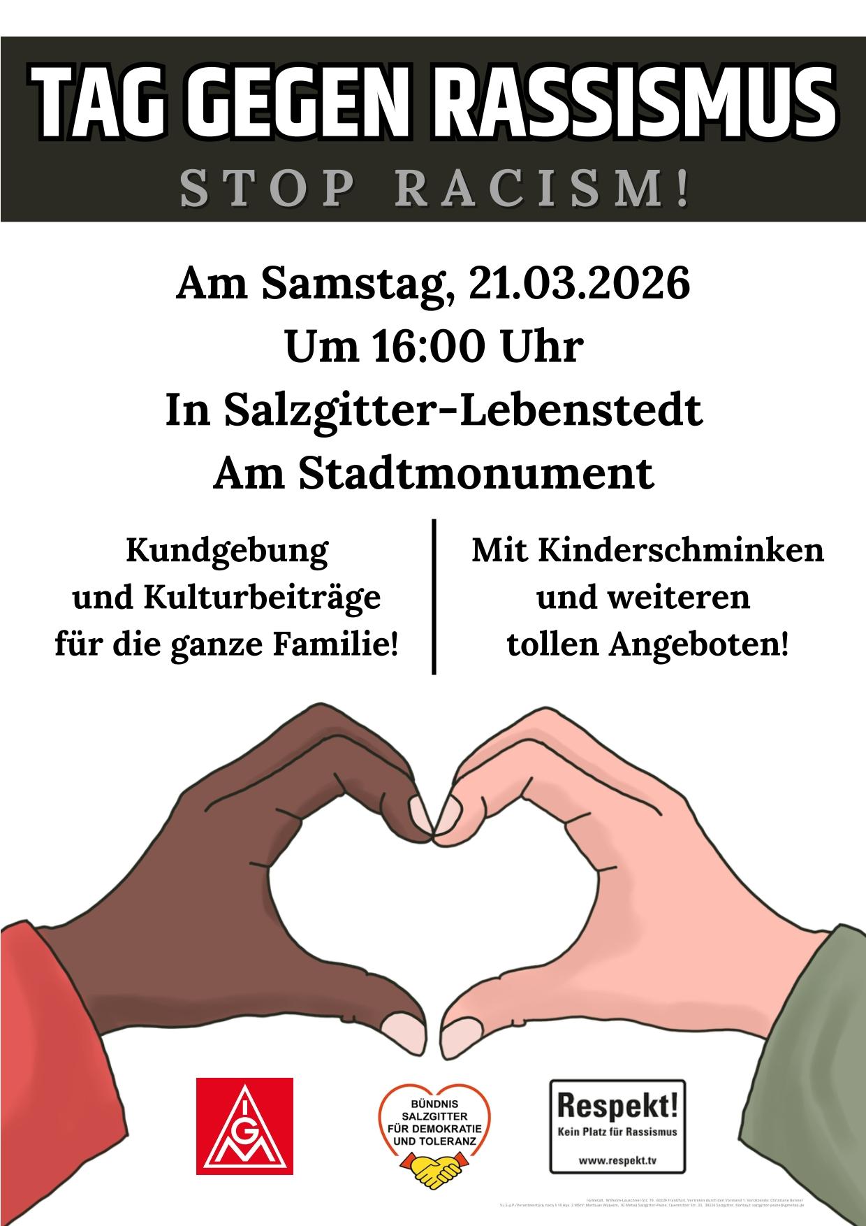 Der Migrationsausschuss der IG Metall Salzgitter-Peine lädt gemeinsam mit dem Bündnis Salzgitter für Demokratie und Toleranz anlässlich des Internationalen Tags gegen Rassismus am 21. März 2026 zu einer Kundgebung am Stadtmonument in Salzgitter ein.